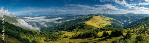 Panoramic View of Misty Green Mountain Valley Under Blue Sky
