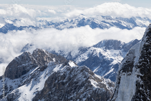 Panoramic view of snow-capped mountains from the Zugspitze peak in the Alps