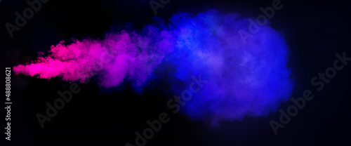 Panoramic view of the abstract neon fog. Colourful cloudiness, mist or smog moves on black background.