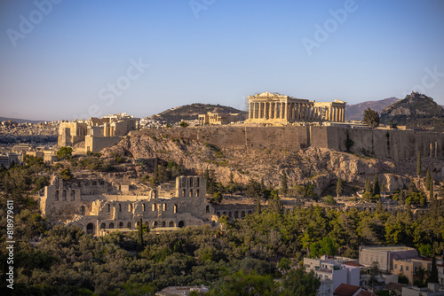 Panoramic view of the Acropolis of Athens from the Philopappos hill in Greece