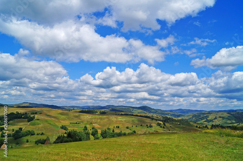 Panoramic view of the Carpathian mountains, green forests and flowering meadows on a sunny summer day
