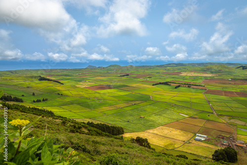 Panoramic view of the colorful agricultural fields from Serra do Cume lookout on Terceira Island, Azores, Portugal. Lush green, yellow, and brown farmlands form a scenic patchwork landscape