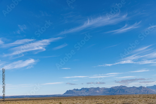 Panoramic view of the Hvannadalshnukur mountain range on the South Coast of Iceland with various glaciers seen from Þjóðvegur or Route 1 with feathered clouds in blue sky