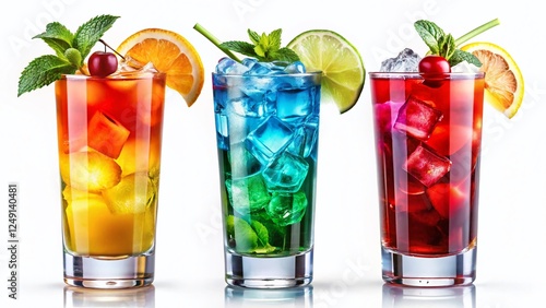 Panoramic View: Three Vibrant Cocktails Isolated on White Background – Perfect for Beverage Menu Design