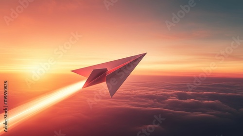 Paper airplane soaring above clouds at sunset.