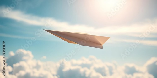 Paper airplane soaring through air, sunlight glinting off wings, light, flight