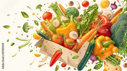 Paper bags filled with vegetables and fruit fly around inside, creating an illustrative effect. Colors highlight fresh produce, creating a vibrant atmosphere. Conveying freshness in shopping