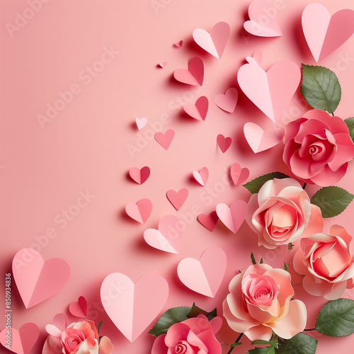 paper hearts flying in the air and roses at the bottom right corner, in a flat lay composition.Minimal cretive emotional and nature concept.