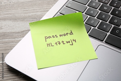 Paper note with password and laptop on wooden table, closeup