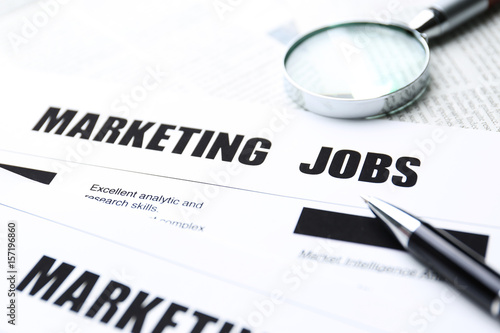 Paper sheet with text MARKETING JOBS, pen and magnifier, closeup