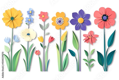 Papercut Style Flowers, Assorted Color Blooms with Leaves, Isolated on White Background