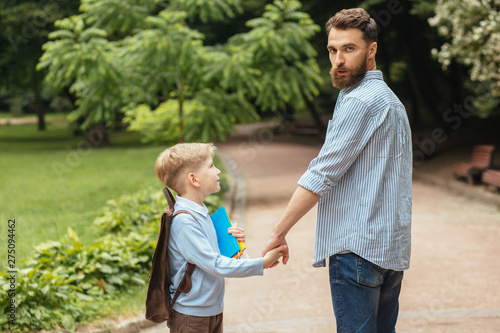 Parent take child to school. Pupil of primary school go study with backpack in park. Father look back at camera, his son go hand in hand. Beginning of lessons. Back to school. First day of fall.