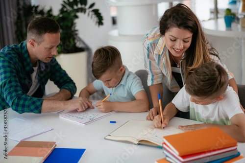 Parents helping the kids with their homework. Litlle boys learning at home.