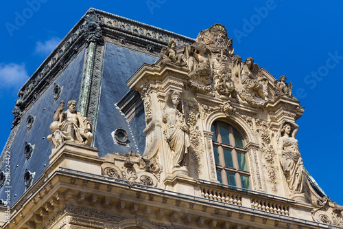 PARIS, FRANCE - JUNE 23, 2017: Gable of the Pavillon Colbert of the Louvre. Is the world largest art museum and is housed in the Louvre Palace, originally built in the late 12th to 13th century.