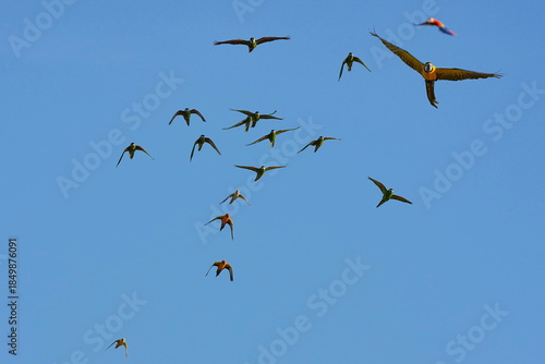 Parrots and macaws are kept as pets until people trust them enough not to fly away, then they are released to fly freely in the air.