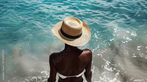 Parte traseira jovem pele bronzeada em chapéu de sol e biquíni em pé com os braços levantados para a cabeça curtindo mar com água