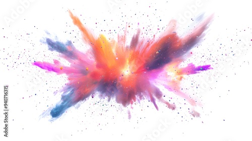 Particle Explosion: A cloud of colorful particles exploding outward, captured in high detail on a white background.