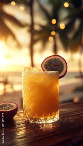 passion fruit margarita cocktail in a glass at a bar on the beach