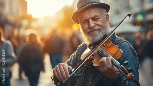 passionate street musician playing the violin on a busy European street, people stopping to listen, deep emotions on his face, ultra-realistic, high-quality depth of field, golden hour glow