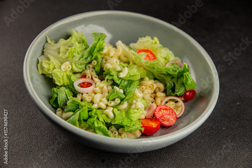 Pasta salad green leaf lettuce, tomato, pasta, onion fresh delicious gourmet food background on the table rustic food top view copy space keto and paleo diet vegan and vegetarian food