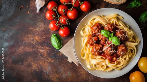 Pasta with Meatballs in Tomato Sauce, Classic Italian Dish with Al Dente Pasta, Tender Meatballs, and Rich Tomato Sauce, Hearty Meal Isolated on Background with Copy Space. Italian Food Concept with C