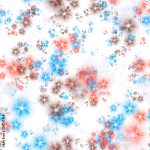 Pastel brown, pacific blue and pinkish orange transparent flowers on the white background. Seamless hand drawn pattern. Pattern for wrapping, textile, print
