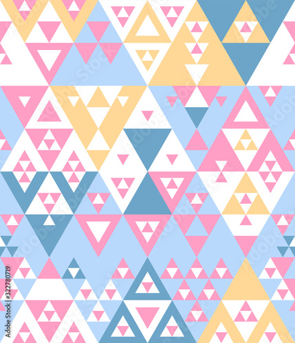 Pastel colored blue pink yellow and white various triangles geometric abstract ethnic seamless pattern, vector