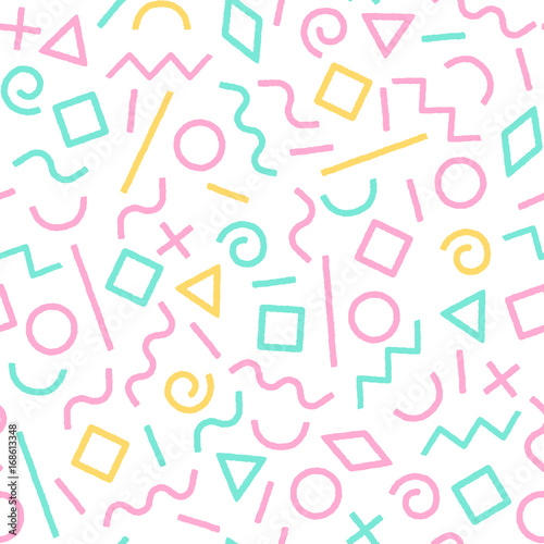 Pastel colored memphis abstract geometric shapes seamless pattern, vector