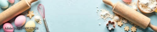 Pastel Easter baking scene Flour, sugar, rolling pin, whisk, cookie cutters , bakery, high-resolution, background