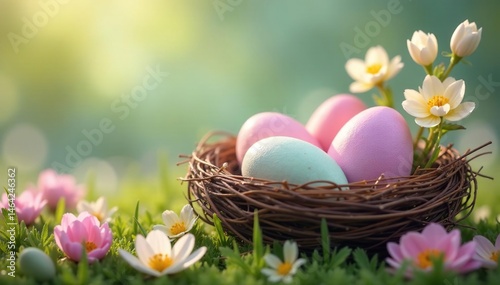 Pastel eggs in a spring nest, vibrant flowers , blue, delicate