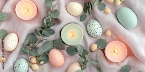 Pastel eggs with eucalyptus and candles arranged for festive spring decor
