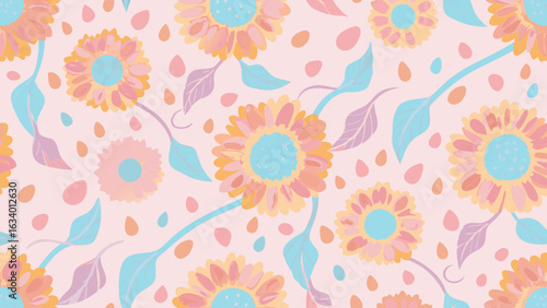 Pastel floral pattern featuring sunflowers leaves and small dots on a light pink background design image