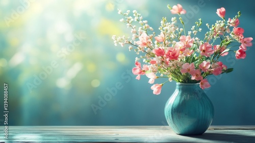 Pastel Flower Bouquet in Blue Vase on Wooden Table with Bokeh Background