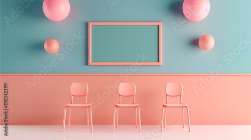 Pastel Minimalism: A serene and stylish interior design concept with three pink chairs, a blank picture frame, and pastel pink and blue walls. The image evokes a sense of calm and sophistication.