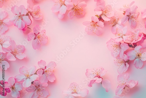 Pastel pink background displays delicate cherry blossoms. Blooming flowers create spring theme. Soft light illuminates gentle petals. Dreamy romantic style. Image suitable for spring cards, fashion