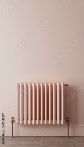 Pastel radiator cover painted softly glowing faintly in muted tones across calm minimalist home