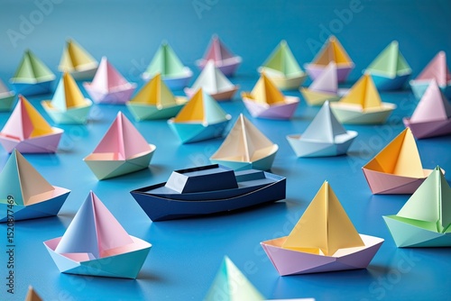 Pastel-colored Paper Boats Navigating Towards a Shared Destination with a Distinct Dark Boat on a Bright Blue Surface