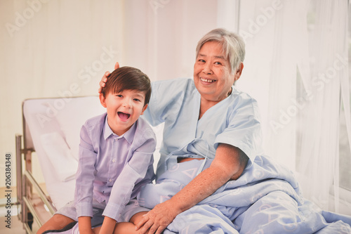 Patient Concept. Grandma's in the hospital. Waiting for someone to visit. Grandchildren visit grandma at the hospital. Grandma is happy to meet grandchildren.