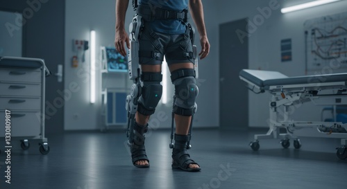 Patient wearing high-tech exoskeleton in hospital room. Rehabilitation technology for mobility assistance. Medical innovation for neurological disorders and paralysis treatment.