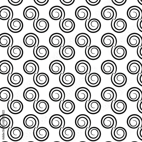 Pattern of black spiral motifs on white background. Suitable for decorations and textiles.