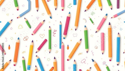 pattern of colored pencils arranged in various directions against a white background. The pencils come in a variety of colors, including red, orange, yellow, green, blue, and pink, creating a cheerful