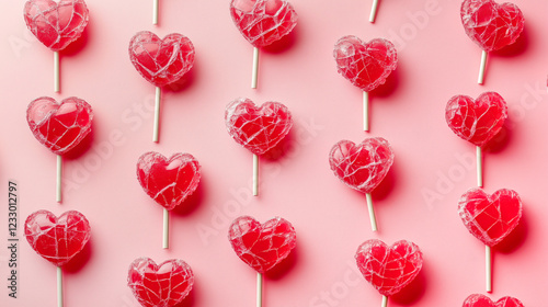 Pattern of cracked and broken red heart shaped lollipops on a stick on a pink background from the top view. Symbolism of romance and the holiday of Valentine's Day.