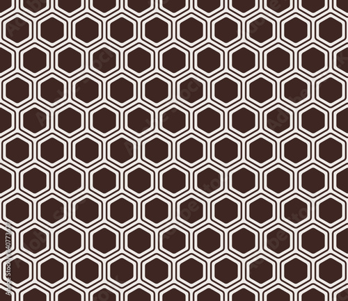 Pattern of hexagon shapes. Dark brown color on matching background. Bold rounded hexagons mosaic pattern with inner solid cells. Seamless tileable vector illustration.