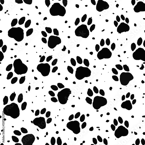 Pattern with black paw prints of a dog, cat on a white background in grunge style. Drawn with brush strokes, splashes, blots.