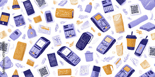 Pattern with payment icons, POS terminals, QR codes, bank cards, and receipts. Modern design in blue and gold colors, symbolizing digital finance, contactless transactions, and shopping..
