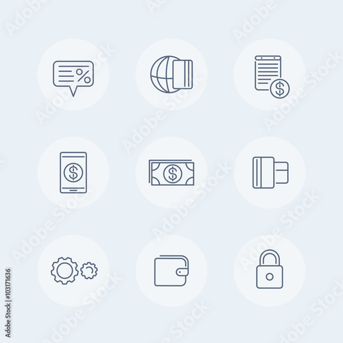 Payment methods thin line icons, electronic payment, credit card, wallet, mobile payment, cash icons, vector illustration