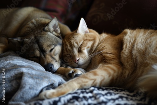 Peaceful image capturing a dog and cat cozily sleeping side by side, symbolizing harmony