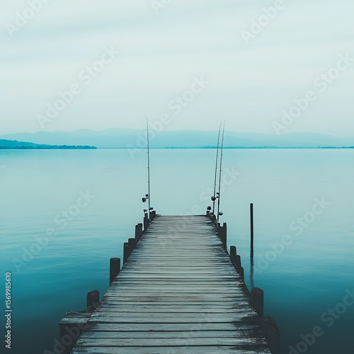 Peaceful lakeside dock setup for fishing during tranquil sunrise high resolution picture