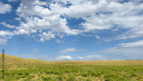Peaceful steppe landscape blue sky and field