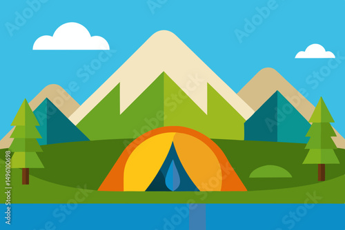 Peaceful Summer Camping Scene with Tent by the Calm Lake Vector Illustration Background